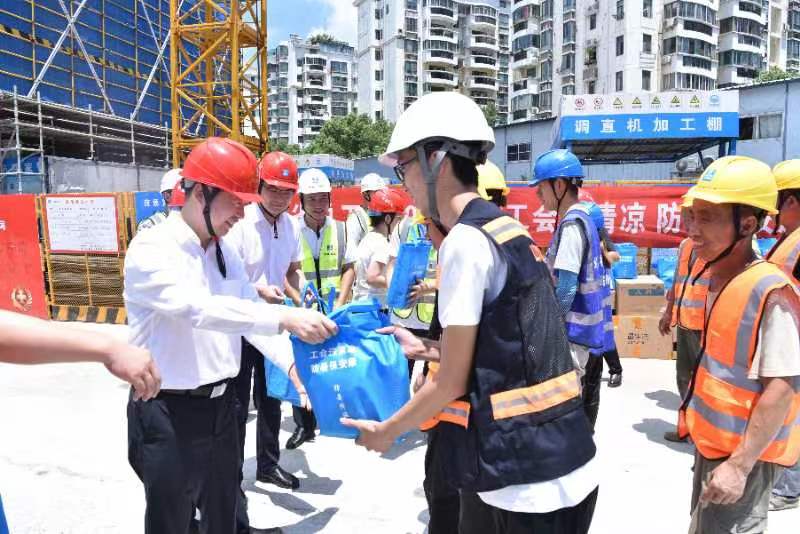 陈惠霞一行深入项目现场工友驿站与正在临时休息的工友面对面交流,详细了解他们的工作生活状况和后勤保障情况,充分肯定一线职工的敬业精神和高度责任感,感谢他们不畏酷暑、坚守岗位的辛勤付出,叮嘱他们在高温中工作要注意防暑,保障自身安全健康,并为一线职工发放了西瓜、饮料和“防暑降温礼包”等慰问品。 ?