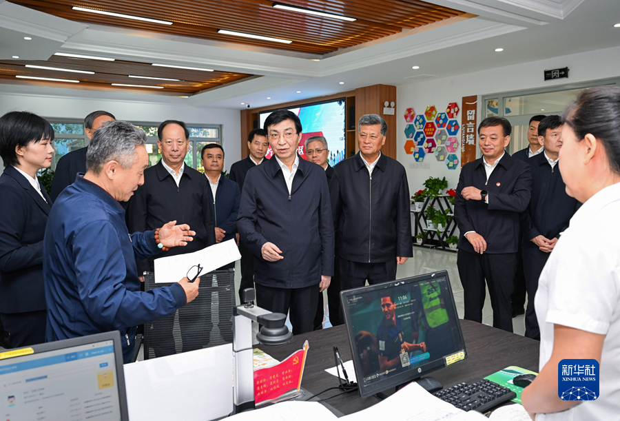 9月19日至21日,第九次全国对口支援新疆工作会议在新疆喀什召开。中共中央政治局常委、全国政协主席王沪宁出席并讲话。在新疆期间,王沪宁还到伊犁、喀什、克孜勒苏和兵团第四师等地调研,看望援疆干部和基层群众。这是9月19日王沪宁在伊宁解放路街道六星街社区了解便民服务和推进民族团结进步情况,就主题教育开展情况进行调研指导。新华社记者 饶爱民 摄